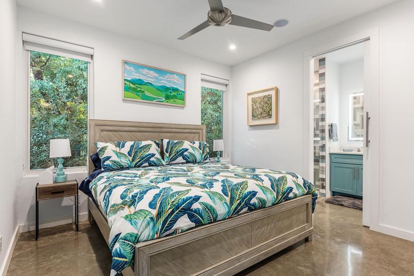 The third leg of this Design District trifecta is the two-bedroom, two-bath guest house with a charm all its own. It features a full eat-in kitchen set against two-tone cabinetry. I also love the look of the exposed beams in the living area.